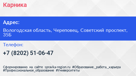 Карника по адресу Вологодская область, Череповец, Советский проспект, 35Б в дальнейшем Организация, размещена в следующих категориях: