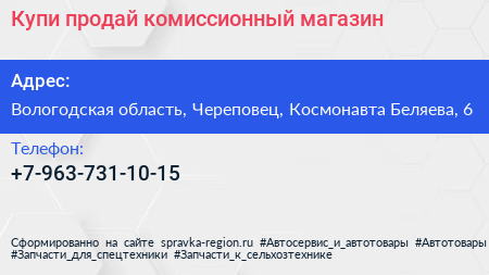 Купи-продай, комиссионный магазин по адресу Вологодская область, Череповец, Космонавта Беляева, 6 в дальнейшем Организация, размещена в следующих категориях: