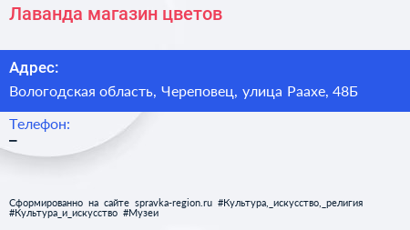 Лаванда, магазин цветов по адресу Вологодская область, Череповец, улица Раахе, 48Б в дальнейшем Организация, размещена в следующих категориях: