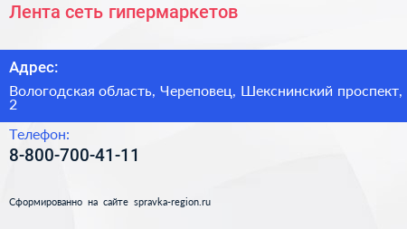 Лента, сеть гипермаркетов по адресу Вологодская область, Череповец, Шекснинский проспект, 2 в дальнейшем Организация, размещена в следующих категориях: