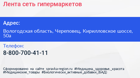 Лента, сеть гипермаркетов по адресу Вологодская область, Череповец, Кирилловское шоссе, 50а в дальнейшем Организация, размещена в следующих категориях:
