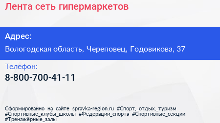 Лента, сеть гипермаркетов по адресу Вологодская область, Череповец, Годовикова, 37 в дальнейшем Организация, размещена в следующих категориях: