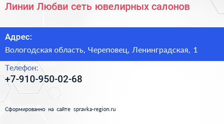Линии Любви, сеть ювелирных салонов по адресу Вологодская область, Череповец, Ленинградская, 1 в дальнейшем Организация, размещена в следующих категориях: