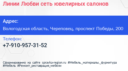 Линии Любви, сеть ювелирных салонов по адресу Вологодская область, Череповец, проспект Победы, 200 в дальнейшем Организация, размещена в следующих категориях: