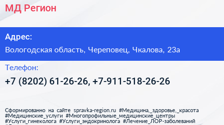 МД Регион по адресу Вологодская область, Череповец, Чкалова, 23а в дальнейшем Организация, размещена в следующих категориях: