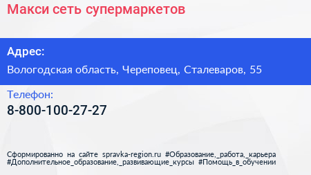 Макси, сеть супермаркетов по адресу Вологодская область, Череповец, Сталеваров, 55 в дальнейшем Организация, размещена в следующих категориях: