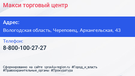 Макси, торговый центр по адресу Вологодская область, Череповец, Архангельская, 43 в дальнейшем Организация, размещена в следующих категориях: