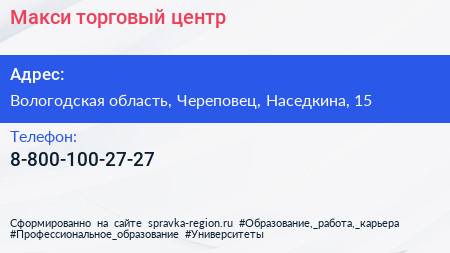 Макси, торговый центр по адресу Вологодская область, Череповец, Наседкина, 15 в дальнейшем Организация, размещена в следующих категориях: