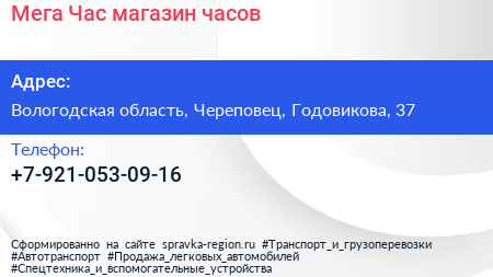 Мега Час, магазин часов по адресу Вологодская область, Череповец, Годовикова, 37 в дальнейшем Организация, размещена в следующих категориях: