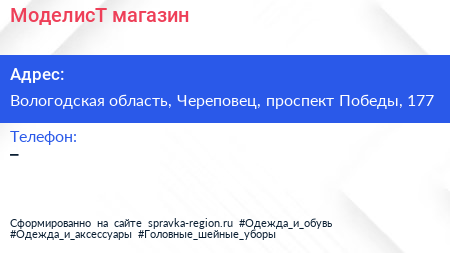 МоделисТ, магазин по адресу Вологодская область, Череповец, проспект Победы, 177 в дальнейшем Организация, размещена в следующих категориях: