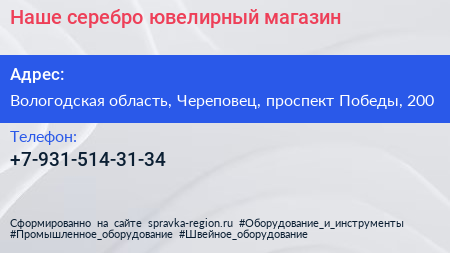 Наше серебро, ювелирный магазин по адресу Вологодская область, Череповец, проспект Победы, 200 в дальнейшем Организация, размещена в следующих категориях: