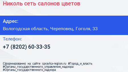 Николь, сеть салонов цветов по адресу Вологодская область, Череповец, Гоголя, 33 в дальнейшем Организация, размещена в следующих категориях:
