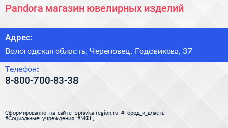 Pandora, магазин ювелирных изделий по адресу Вологодская область, Череповец, Годовикова, 37 в дальнейшем Организация, размещена в следующих категориях: