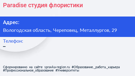 Paradise, студия флористики по адресу Вологодская область, Череповец, Металлургов, 29 в дальнейшем Организация, размещена в следующих категориях: