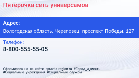 Пятерочка, сеть универсамов по адресу Вологодская область, Череповец, проспект Победы, 127 в дальнейшем Организация, размещена в следующих категориях: