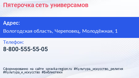Пятерочка, сеть универсамов по адресу Вологодская область, Череповец, Молодёжная, 1 в дальнейшем Организация, размещена в следующих категориях: