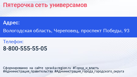 Пятерочка, сеть универсамов по адресу Вологодская область, Череповец, проспект Победы, 93 в дальнейшем Организация, размещена в следующих категориях: