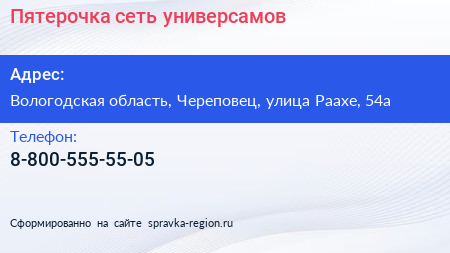 Пятерочка, сеть универсамов по адресу Вологодская область, Череповец, улица Раахе, 54а в дальнейшем Организация, размещена в следующих категориях: