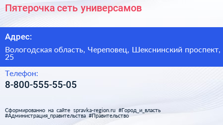 Пятерочка, сеть универсамов по адресу Вологодская область, Череповец, Шекснинский проспект, 25 в дальнейшем Организация, размещена в следующих категориях:
