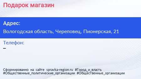 Подарок, магазин по адресу Вологодская область, Череповец, Пионерская, 21 в дальнейшем Организация, размещена в следующих категориях: