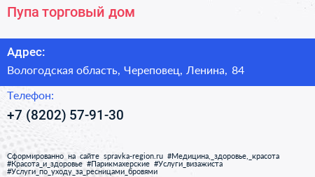 Пупа, торговый дом по адресу Вологодская область, Череповец, Ленина, 84 в дальнейшем Организация, размещена в следующих категориях:
