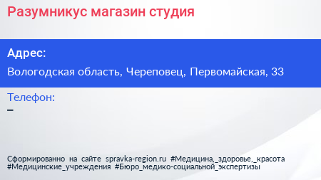 Разумникус, магазин-студия по адресу Вологодская область, Череповец, Первомайская, 33 в дальнейшем Организация, размещена в следующих категориях: