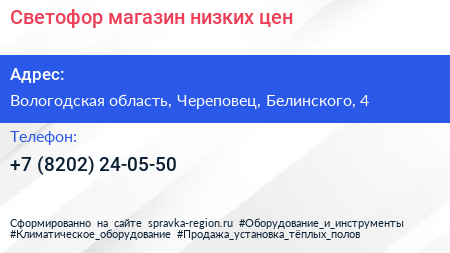 Светофор, магазин низких цен по адресу Вологодская область, Череповец, Белинского, 4 в дальнейшем Организация, размещена в следующих категориях: