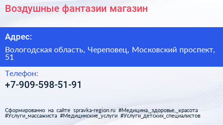 Воздушные фантазии, магазин по адресу Вологодская область, Череповец, Московский проспект, 51 в дальнейшем Организация, размещена в следующих категориях: