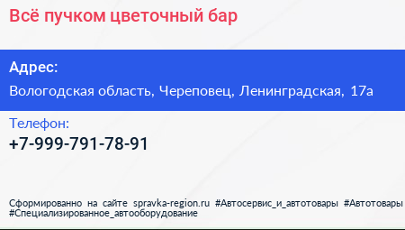 Всё пучком, цветочный бар по адресу Вологодская область, Череповец, Ленинградская, 17а в дальнейшем Организация, размещена в следующих категориях: