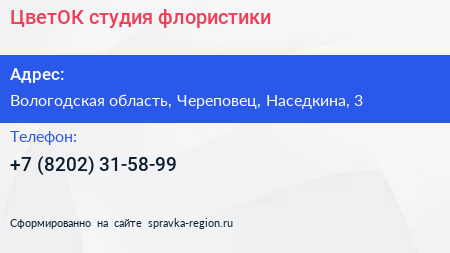 ЦветОК, студия флористики по адресу Вологодская область, Череповец, Наседкина, 3 в дальнейшем Организация, размещена в следующих категориях:
