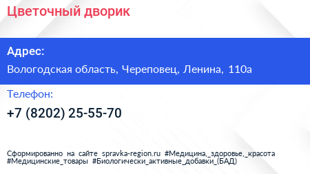 Цветочный дворик по адресу Вологодская область, Череповец, Ленина, 110а в дальнейшем Организация, размещена в следующих категориях: