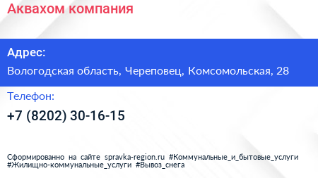Аквахом, компания по адресу Вологодская область, Череповец, Комсомольская, 28 в дальнейшем Организация, размещена в следующих категориях: