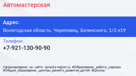 Автомастерская по адресу Вологодская область, Череповец, Белинского, 1/3 к19 в дальнейшем Организация, размещена в следующих категориях: