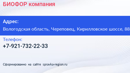 БИОФОР, компания по адресу Вологодская область, Череповец, Кирилловское шоссе, 88 в дальнейшем Организация, размещена в следующих категориях: