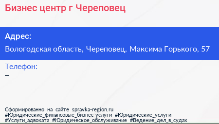 Бизнес-центр, г. Череповец по адресу Вологодская область, Череповец, Максима Горького, 57 в дальнейшем Организация, размещена в следующих категориях: