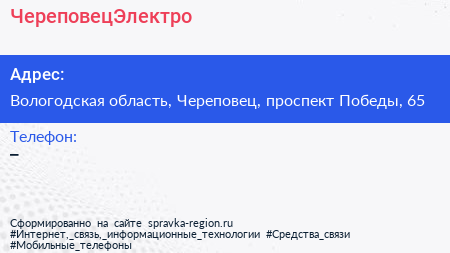 ЧереповецЭлектро по адресу Вологодская область, Череповец, проспект Победы, 65 в дальнейшем Организация, размещена в следующих категориях: