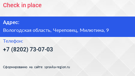Check in place по адресу Вологодская область, Череповец, Милютина, 9 в дальнейшем Организация, размещена в следующих категориях:
