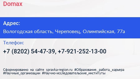Domax по адресу Вологодская область, Череповец, Олимпийская, 77а в дальнейшем Организация, размещена в следующих категориях: