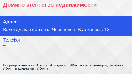 Домино, агентство недвижимости по адресу Вологодская область, Череповец, Курманова, 13 в дальнейшем Организация, размещена в следующих категориях: