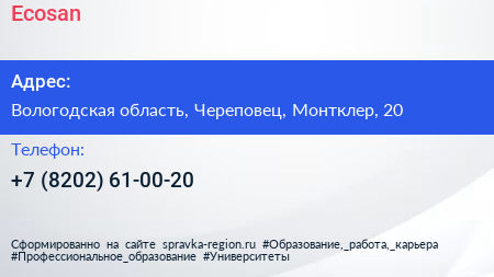 Ecosan по адресу Вологодская область, Череповец, Монтклер, 20 в дальнейшем Организация, размещена в следующих категориях: