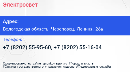 Электросвет по адресу Вологодская область, Череповец, Ленина, 26а в дальнейшем Организация, размещена в следующих категориях: