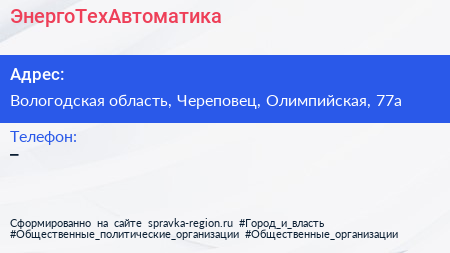 ЭнергоТехАвтоматика по адресу Вологодская область, Череповец, Олимпийская, 77а в дальнейшем Организация, размещена в следующих категориях: