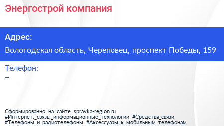 Энергострой, компания по адресу Вологодская область, Череповец, проспект Победы, 159 в дальнейшем Организация, размещена в следующих категориях: