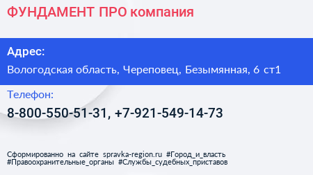 ФУНДАМЕНТ ПРО, компания по адресу Вологодская область, Череповец, Безымянная, 6 ст1 в дальнейшем Организация, размещена в следующих категориях: