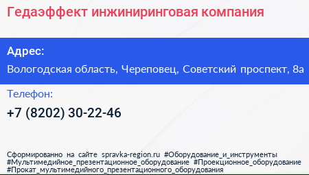 Гедаэффект, инжиниринговая компания по адресу Вологодская область, Череповец, Советский проспект, 8а в дальнейшем Организация, размещена в следующих категориях: