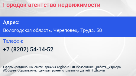 Городок, агентство недвижимости по адресу Вологодская область, Череповец, Труда, 58 в дальнейшем Организация, размещена в следующих категориях:
