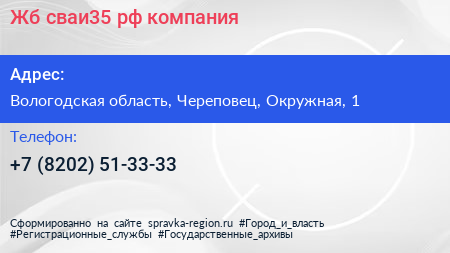 Жб-сваи35.рф, компания по адресу Вологодская область, Череповец, Окружная, 1 в дальнейшем Организация, размещена в следующих категориях: