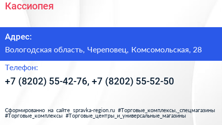 Кассиопея по адресу Вологодская область, Череповец, Комсомольская, 28 в дальнейшем Организация, размещена в следующих категориях: