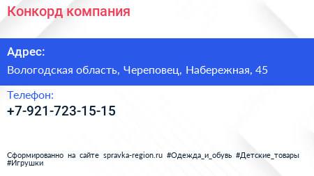 Конкорд, компания по адресу Вологодская область, Череповец, Набережная, 45 в дальнейшем Организация, размещена в следующих категориях: