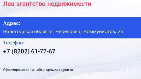 Лев, агентство недвижимости по адресу Вологодская область, Череповец, Коммунистов, 25 в дальнейшем Организация, размещена в следующих категориях: